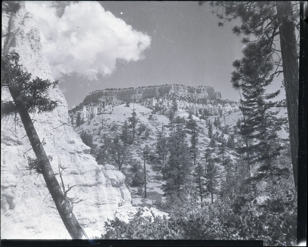 Nitrate negative of hoodoos from below the rim in BRCA. Trees and vegetation in foreground. ; BRCA Museum and Archives Image BRCA8875_001_494 ; BRCA 8875