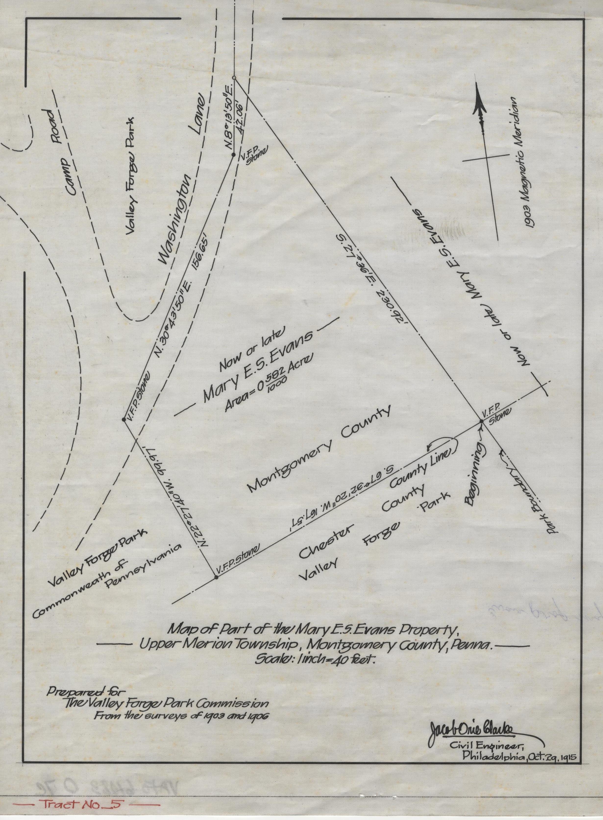 Document: Description of a Tract of Land A Portion of the "Continental Camp Farm" of Mary E.S. Evans, Lying partly in Upper Merion Township, Montgomery County, and partly in Tredyffrin Townsip, Chester County, Pennsylvania