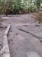 Silt and debris covers a trail, the edge of wood framing visible on one side.