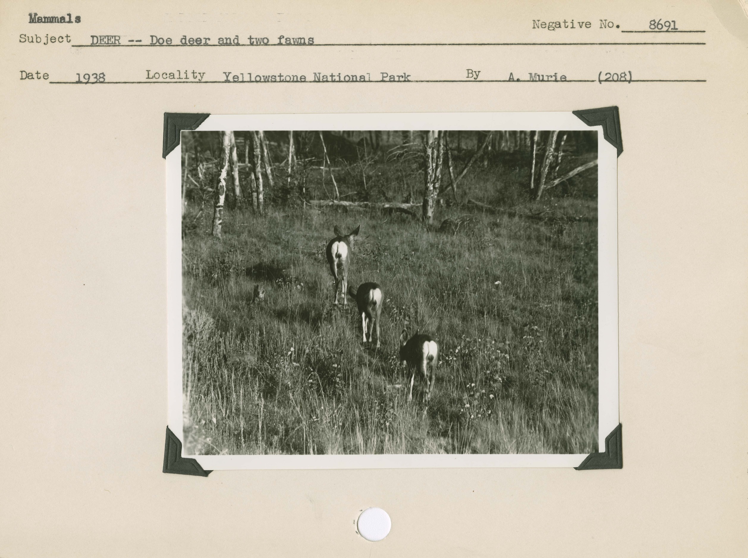 Mule Deer – Doe and two fawns. Locality: Tower Falls, Yellowstone National Park. Negative: 8691. Location of negative: San Francisco. [Some of this information comes from the reverse of the envelope for this negative number. Card specifies 1938 as date, while envelope specifies September 30, 1937].