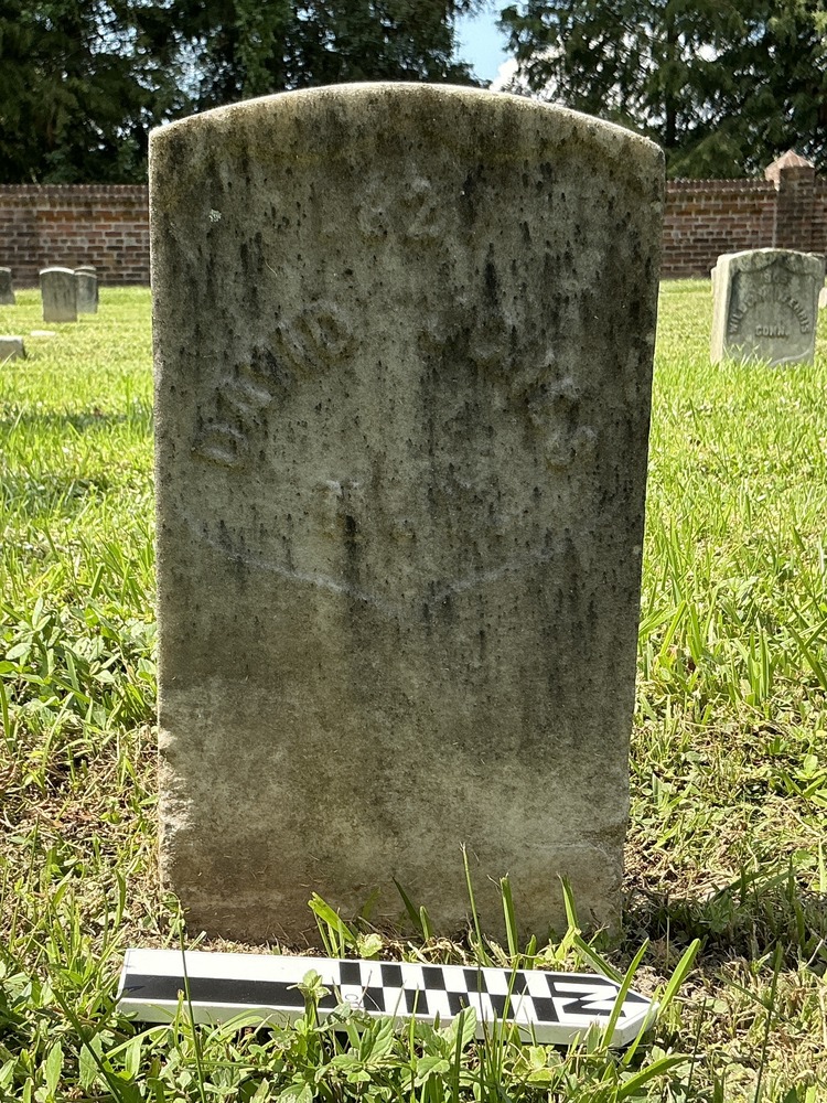 Extra image of historic upright marble headstone with recessed shield face.