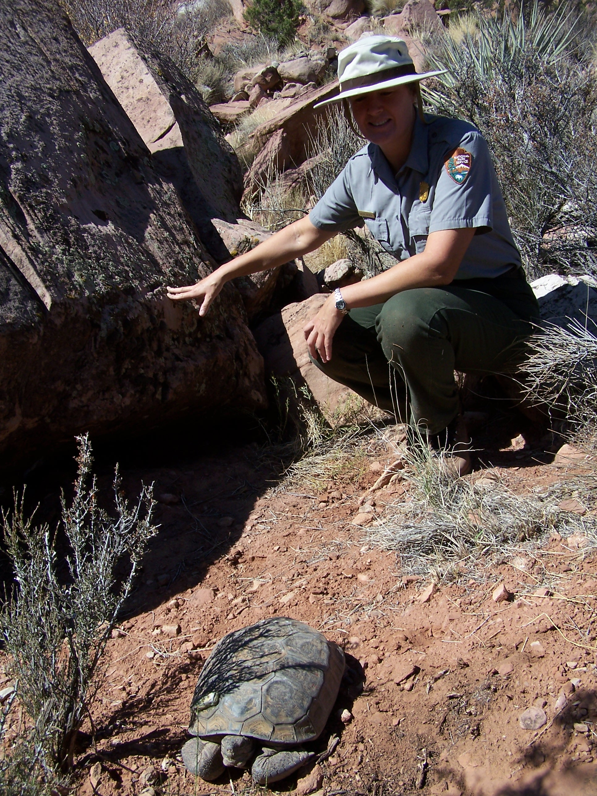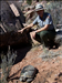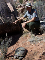 Photo2. Nicole Sedgley, STEP seasonal, looking at tortoise in burrow while location is being downloaded into GPS unit.