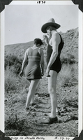 Charles Alexander MacNeilledge and unidentified woman wearing swimsuits near Lower Grapevine Ranch Reservoir. April 19, 1927. Photographed by Mat Roy Thompson. MacNeilledge was the Death Valley Ranch building designer He is wearing a cowboy hat. Both persons wearing shoes. Inscription in black ink, at bottom: Hiking in Death Valley 4-19-27. Number in black ink at top center refers to historic photograph numbering system: 1570. Black and white, vertical format, 3 x 5 inch. Corner mounted in photograph album.