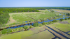 Wide, open fields with wetlands surrounding. This aerial photograph shows a river cutting through the fields, with what looks like irrigation systems in place to water crops.