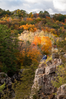 Photograph of colorful autumn landscape with two people in the distance looking out from a rocky cliffside.