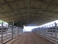 Under a roof with metal rafters, numerous metal pens line either side of a central dirt walkway