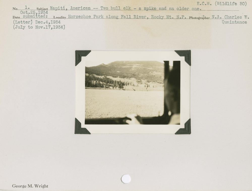 Wapiti, American [Elk]: Two bull elk – a spike and an older one. Negative #: E.C.W. [Emergency Conservation Work] Wildlife 30. Locality: Horseshoe Park along Fall River, Rocky Mountain National Park. Submitted: oct. 25, 1934. Letter: Dec. 4, 1934 (July to Nov. 17, 1934).