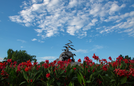 Statue of waves and seagulls surrounded by red flowers