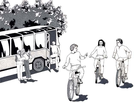 Scene depicts tourists outside of a shuttle bus with bicyclists riding past them.