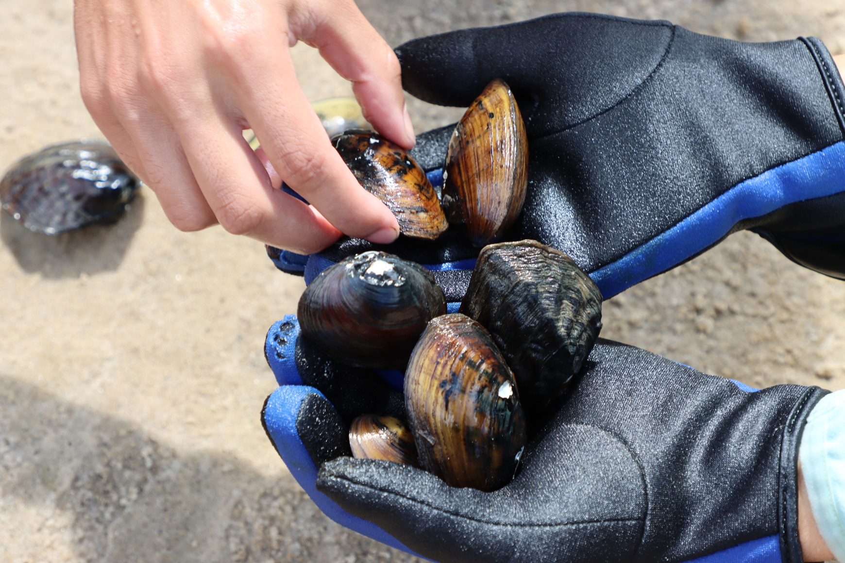 two gloved hands hold 6 mussels while another ungloved hand picks one up.