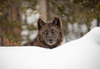 Zoomed in portrait of a wolf which is sitting behind a snow bank with only its head showing.
