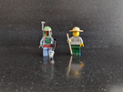 Lego park ranger and Lego star wars Bobba Fet figure, wearing green helmet and gray armor.