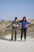 Two women pose side by side on vegetated white sand dunes under a clear blue sky.