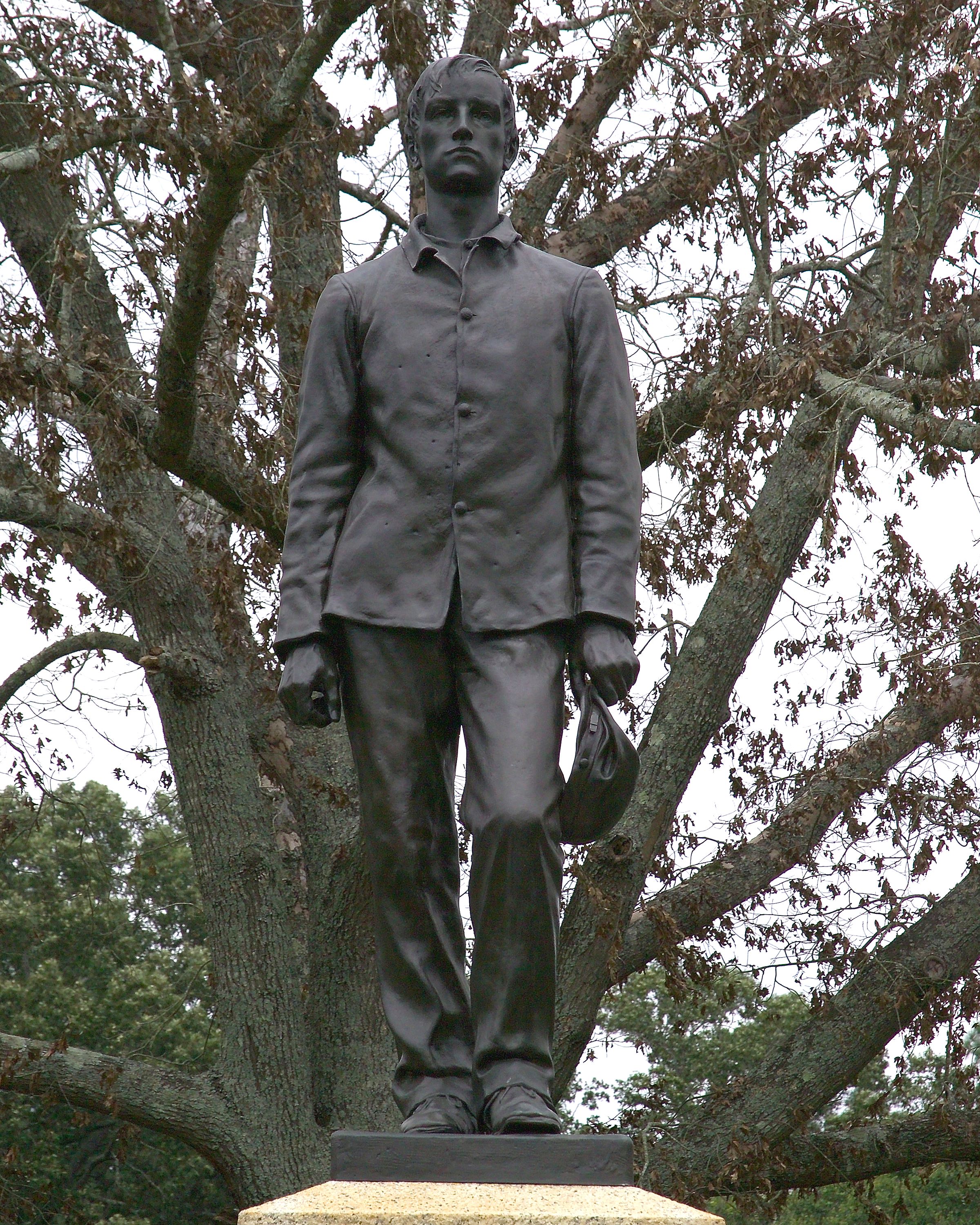 Semicircular composition with a tapering granite pedestal at the center supporting an 8' bronze figure of a soldier. Benches curve out from the pedestal enclosing a granite floor and terminating in granite slabs. 24' 8" wide x 12' 4" deep x 16' high.