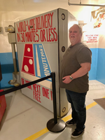 Man in a gray shirt and blue jeans standing next to a large concrete door with a red white and blue domino's pizza logo on it and the words in red: World wide delivery in 30 minutes or less or your next one is free.