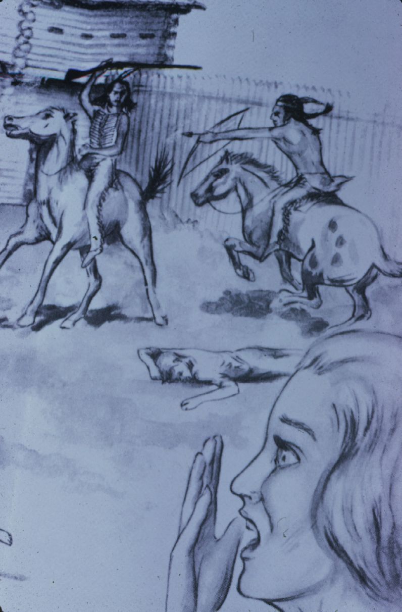 Another segment of #419, woman startled at seeing attacking Indians. (drawing) ; December 1973