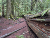 A massive fallen cedar log lies along the start of the Twin Firs Trail.