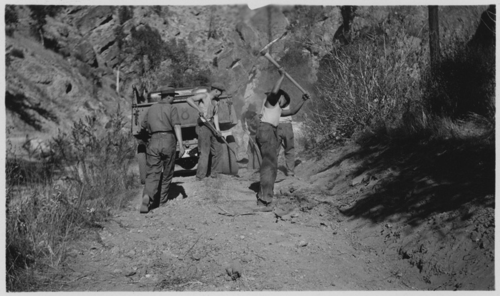 Original ID Chow! Camp NM-4, CCC, Pinnacles, Calif. [Image caption] After swinging a pick⦠[sentences continue with each photograph on page G]. [Reverse side of image] "Do they get any work done?" You ask me. CCC men building road to Old Pinnacles. 10/35., 4.25 x 2.5 inches