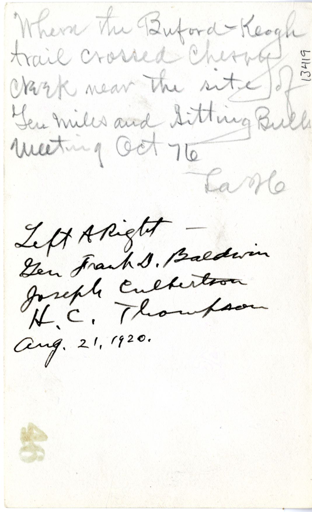 LIBI_00312_13419; Print, Photographic: group photo, Frank D. Baldwin, Joseph Culbertson, andH.C. Thompson, near where Buford-Keogh trail crossed Cherry Creek near the site of Miles meeting with Sitting Bull in OCT1876.; Print, Photographic;Courtesy of the National Park Service, Little Bighorn Battlefield National Monument, LIBI_00312_13419, Unknown Photographer, "Group Photo, Frank E. Baldwin, Joseph Culbertson, and H. C. Thompson Near Where Buford-Keogh Trail Crossed Cherry Creek," 08/21/1920