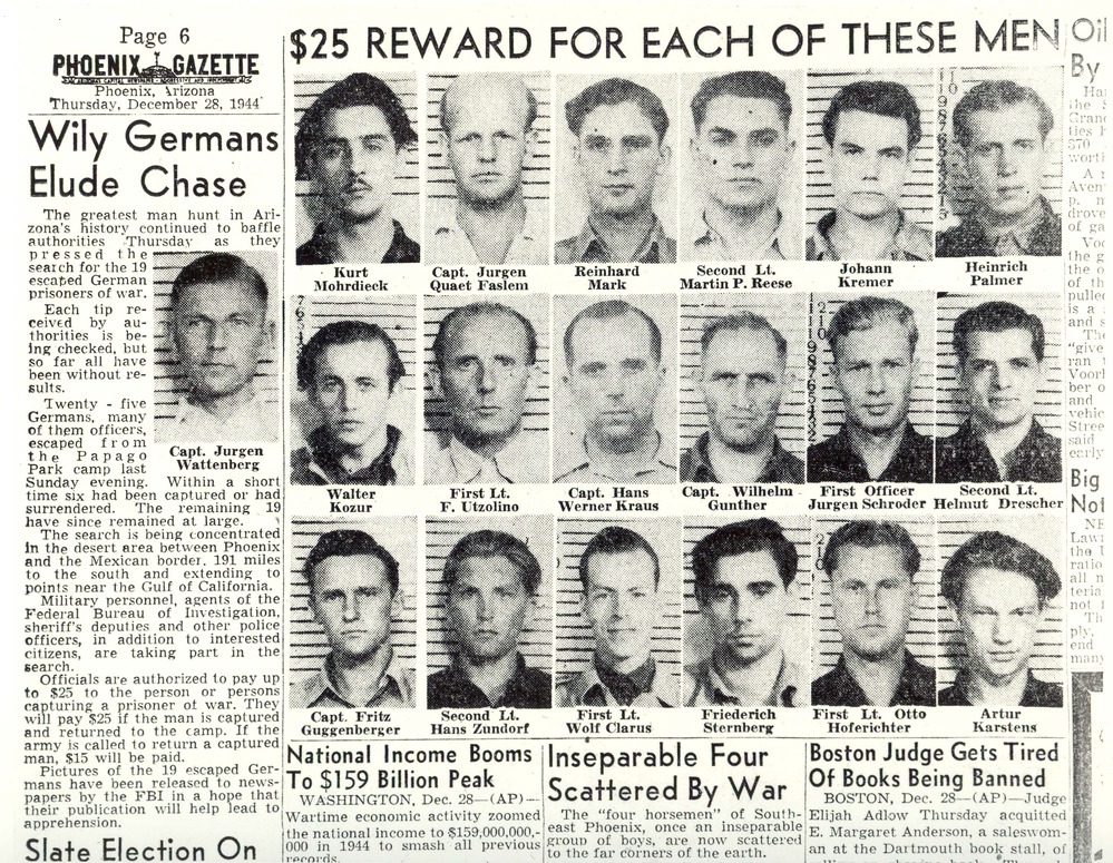 Scan of a newspaper from 1944, published out of Phoenix, Arizona. The left article is titled "Wily Germans Elude Chase," and to the right are 25 photographs of the escaped prisoners with their names. The title above them says "$25 REWARD FOR EACH OF THESE MEN."