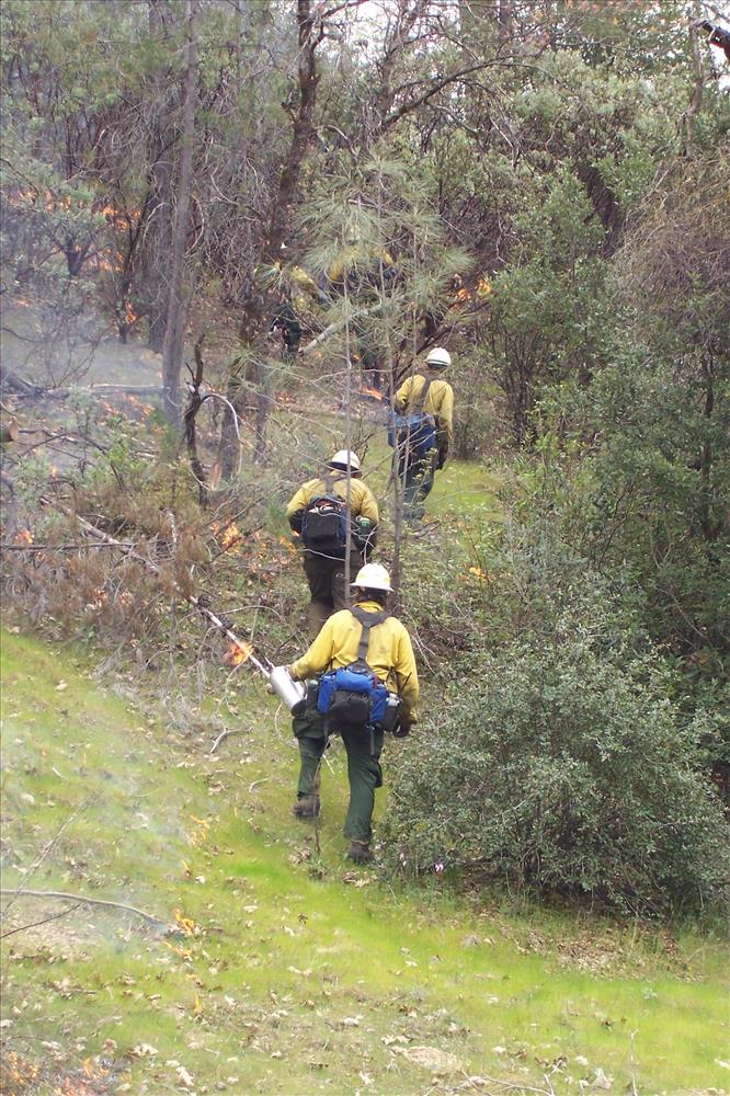 Firestorm, a contract crew, ignites the Buck A Prescribed Fire as they climb a hill.