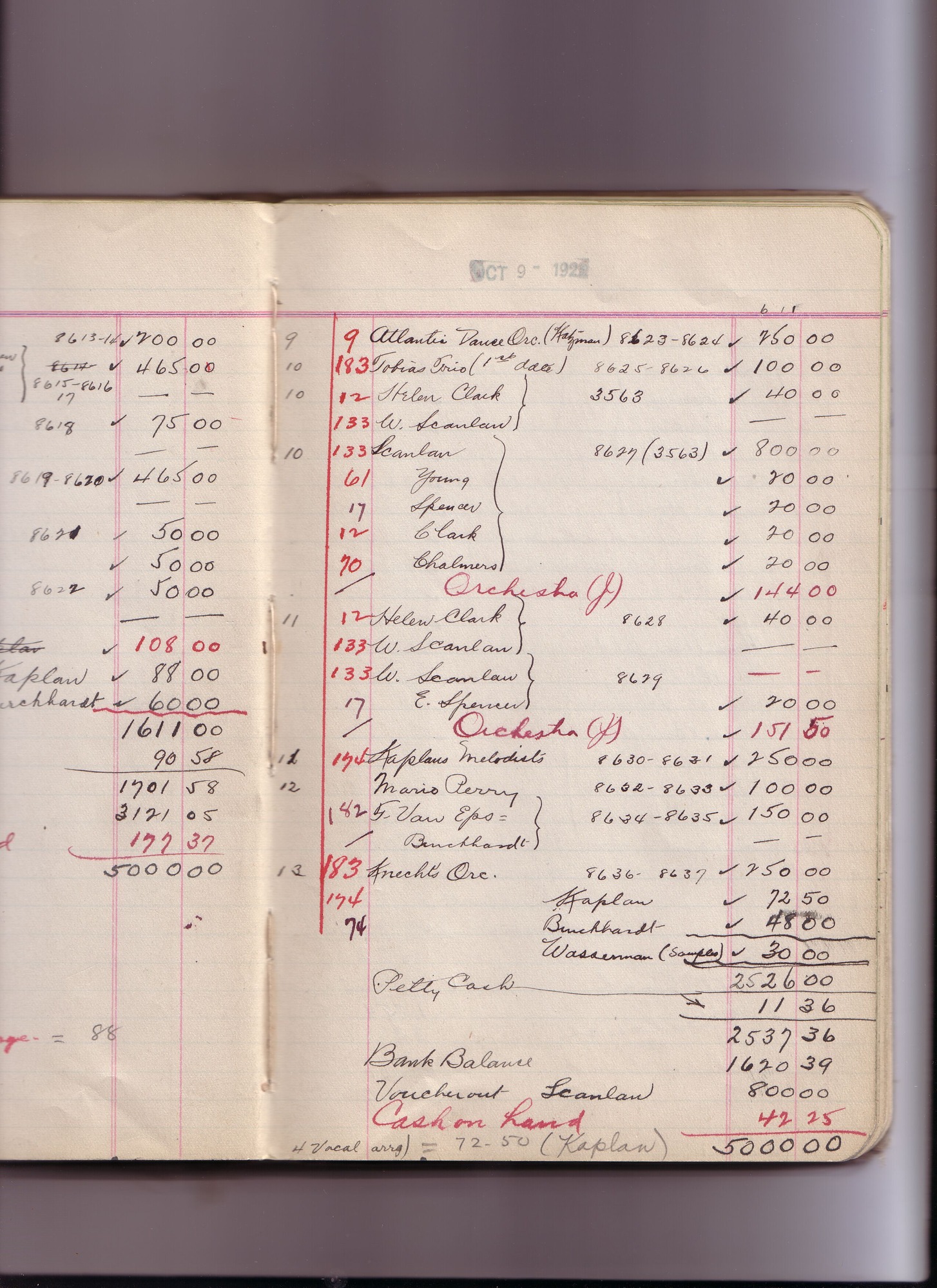 Thomas Edison's New York City Recording Studio Cash Book 17 (of 21), Image 169 (of 244). (Notebook #: PN-21-01-01, NPS catalog #: EDIS 1428), This book documents Diamond Disc matrices 7713 – 9183, expenditures for recording artist fees and other payments authorized by studio manager Walter H. Miller from January 03, 1921 – September 29, 1923. Digitally scanned December 2004 through July 2005 at resolution 300 dpi, 24 bit.