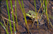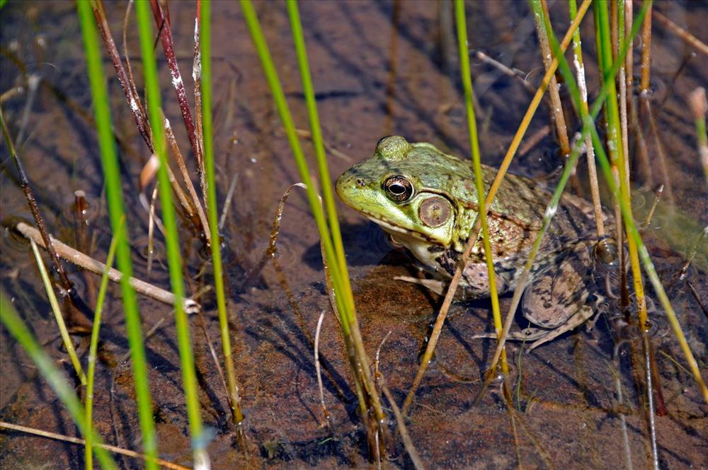 Visitors near ponds may hear what sounds like an old banjo. Unless there happens to be an actual banjo-playing backpacker around, what you are really hearing is a green frog (Rana clamitans). This frog may be any shade of swamp green or brown with a yellow throat. This species is sexually dimorphic: males are smaller than females, the male tympanum is twice the eye diameter while the female tympanum is about half the eye diameter and males have bright yellow throats. Keen observers may witness them sitting along the shore looking for an insect snack.