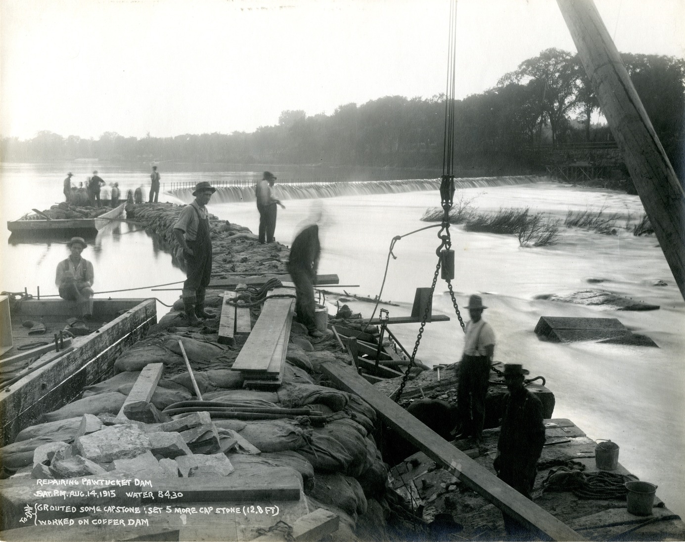 Back to work after the high water recedes. "Today: Grouted some capstone; set 5 more capstone (12.8 feet); worked on coffer dam."