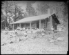 Log cabin in the woods, with Girl Scouts milling on the front porch and in front of the cabin.