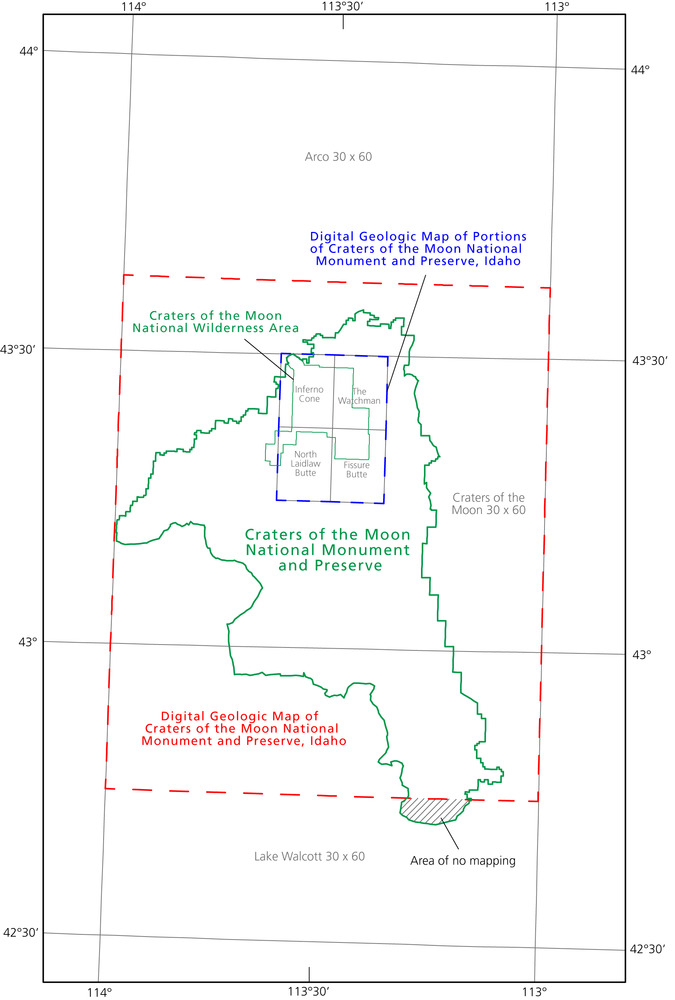 The extent of Digital Geologic Map of Craters of the Moon National Monument and Preserve, Idaho (crmo_geology.mxd; scale 1:100,000) is outlined with a dashed red line and includes the Craters of the Moon 30’ × 60’ quadrangle and portions of the Arco and Lake Walcott 30’ × 60’ quadrangles. The extent of Digital Geologic Map of Portions of Craters of the Moon National Monument and Preserve, Idaho (cotm_geology.mxd; scale 1:24,000) is outlined with a dashed blue line and includes the Fissure Butte, Inferno Cone, North Laidlaw Butte, and The Watchman 7.5’ quadrangles. The gray hatch pattern on the southern edge of the preserve represents an area with no GRI digital geologic map coverage.