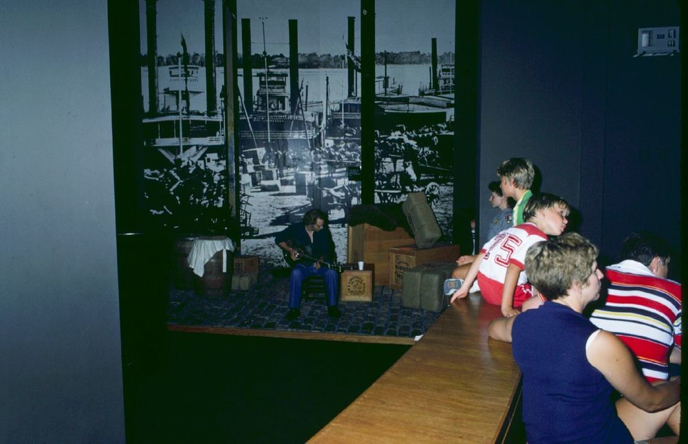 Man playing a guitar in wharf exhibit ; August 1980