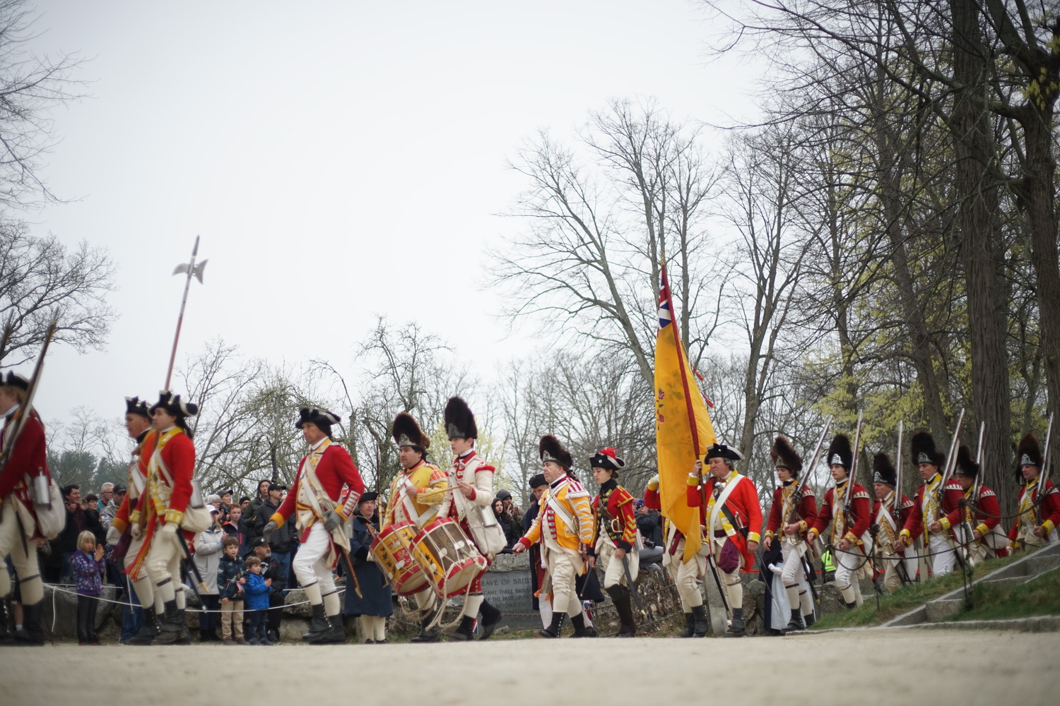 British troops marching from North Bridge past Grave of the British Soldiers, large crowd in background