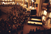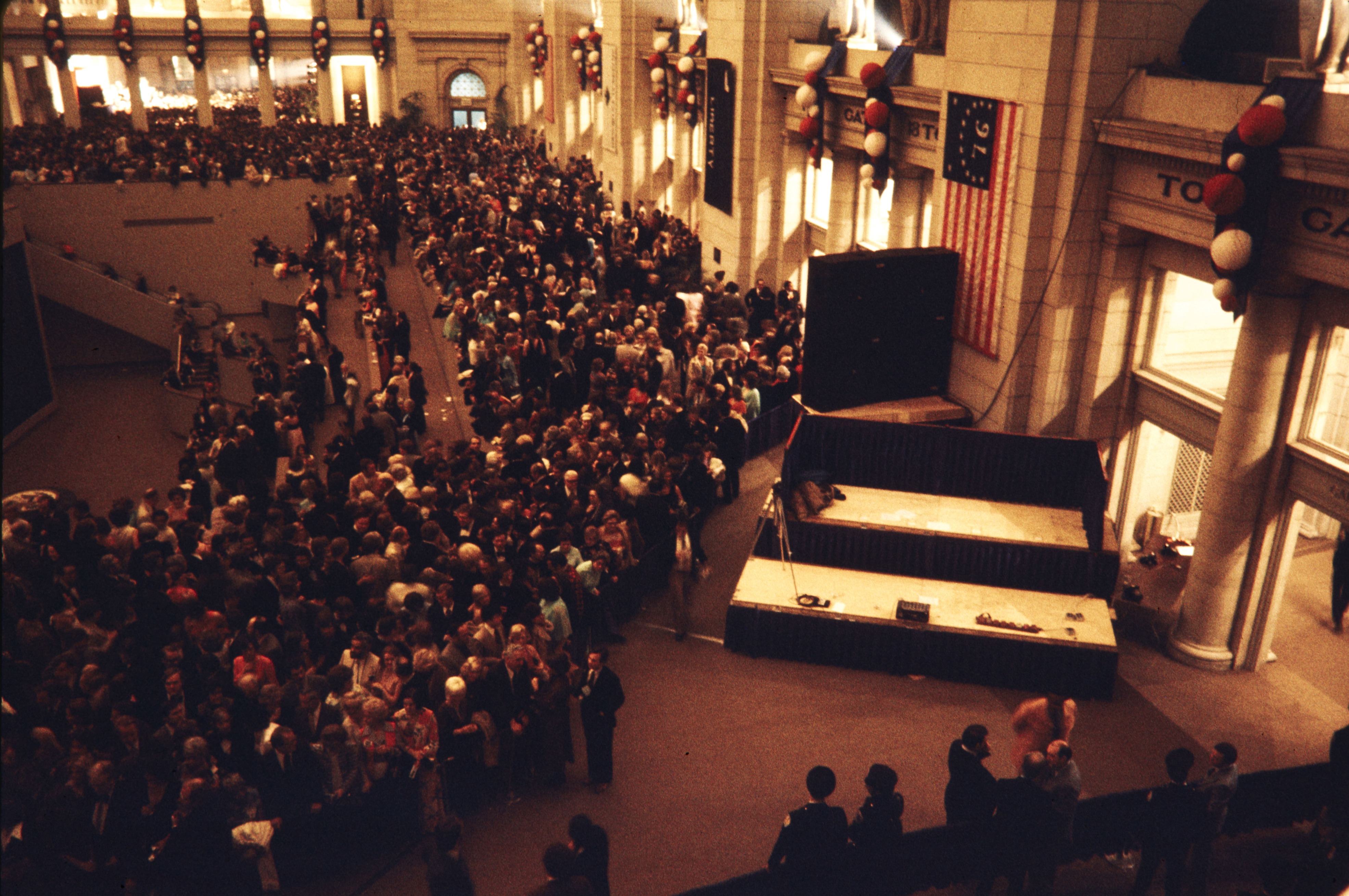 Second story view of an audience standing in front of a stage in Union Station in Washington, D.C..