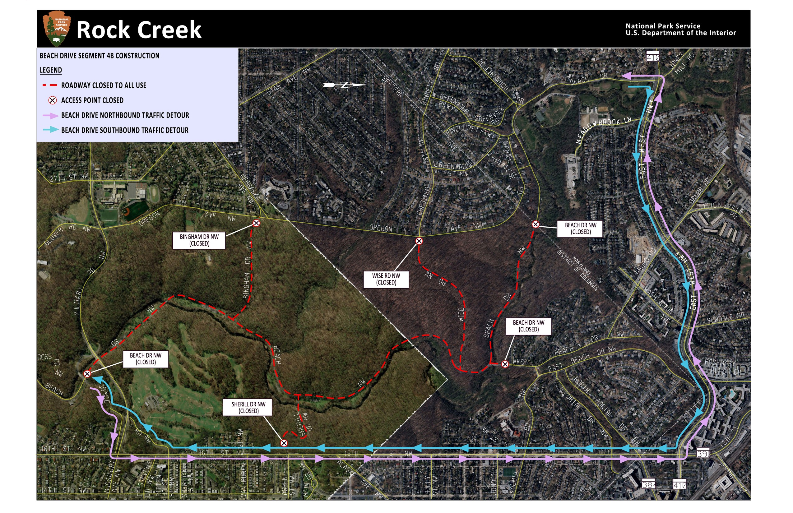 Detour information for drivers around Segment 4 of Beach Drive. Use East-West Highway and 16th Street to bypass construction.