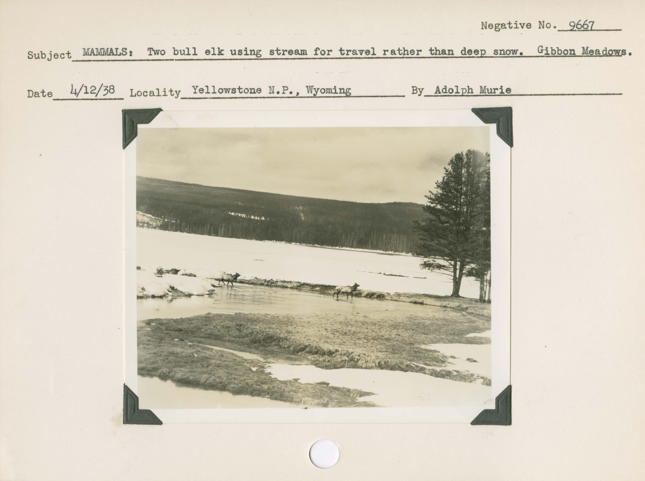 Two bull elk using stream for travel rather than deep snow at Gibbon Meadows. Negative #: 9667. Locality: Yellowstone National Park, Wyoming. Location of Negative: Region Four Headquarters. [Some of this information comes from the reverse of the envelope for this negative number].