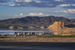 marina viewed from above, surrounded by sandy hills, flat topped geologic formation behind right, mountains cloudy sky in distance, foliage foreground