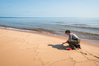 Photograph of a person kneeling on a sandy beach releasing a small plover onto the sand with a background of blue water and a distant, tree-lined shoreline.