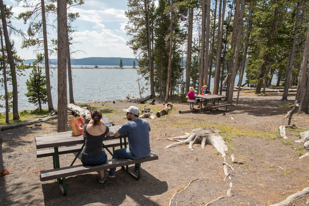 Two couples sitting at two different picnic tables next to Yellowstone Lake.