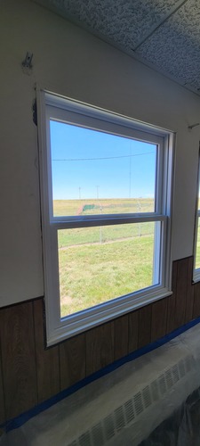 Through a white wall wood paneling, a view through a window of a grassy field.