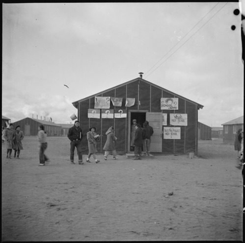 The full caption for this photograph reads: Tule Lake Relocation Center, Newell, California. One of the barracks at this center which is used for a high school. As yet the students haven't decided on a name for the school.