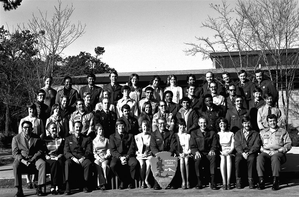First row (l. to r.) Ernest Suazo, Chamizal; Karen Wade, Albright; Boyd Evison, Albright; Pat Blech, Albright; Bill Wade, Albright; Ann Baugh, Albright; Dale Thompson, Albright; Ginger Bice, Albright; Stu Croll, Albright; Myrna Keeling, Albright; Don Herring, Grand Canyon; Doug Fryer, Sequoia. Second row (l. to r.) Kathy Aust, Western Pennsylvania Group; Mary Robinson, Kennedy Center; D.C. Bush, Lava Beds; Chuck Stebbins, NCP; Joe Hudick, Cape Hatteras; Brenda Hooks, NCP; Shirley Clark, PNWRO; Richard Portillo, Buffalo River; Ken Perry, NCP; John Lissoway, Sunset Creater; Joe Bowden, Morristown. Third row (l. to r.) Allen Keske, Denver Service Center; Steve Iobst, Denver Service Center; Walt Kelly, Lincoln Home; Dorothy Shally, Death Valley; Larry Gamble, Denver Service Center; Calvin Herrera, Big Horn Canyon; Deavid Newman, NCP West; Bill Aubertin, Coulee Dam; Bill Foster, Yellowstone; Ben Nelson, Fort Sumter; Larry Dilts, Jewel Cave. Fourth row (l. to r.) Bonnie Miller, Western RO; Dorothy Benton, NCP East; Ray Olivas, Chamizal; Frank Drumm, Saratoga; Michele Farmer, Theodore Roosevelt; Joe Duran, Southwest Regional Office; Gay Ann Mayes, Hubbell; Richard Razo, Saguaro; Paul Lee, Shenandoah; Glenn Clark, Lassen; Charlie Peterson, Carlsbad-Guadalupe; Robert Huggins, Grand Teton.