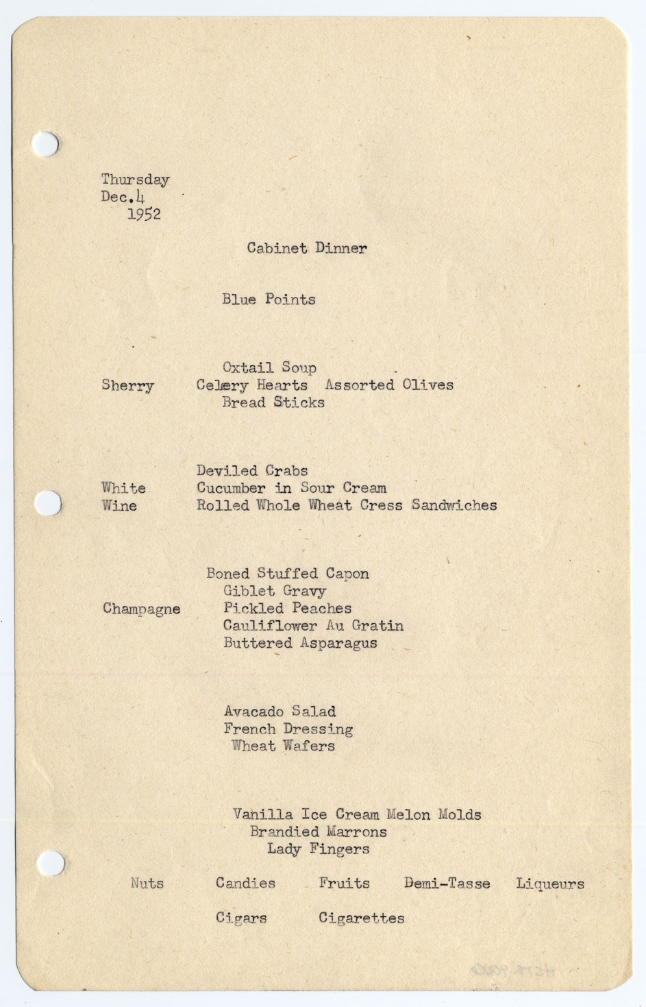 Menus for the Truman's time in the White House from November 1952 to January 1953. There are 81 menus in total. Menus consist of lunch and dinner everyday, including special meals like Cabinet dinners, Thanksgiving, and Christmas meals. Some of the meals have edits made in pencil or notes about how many people and who is going to be gone for the meal.