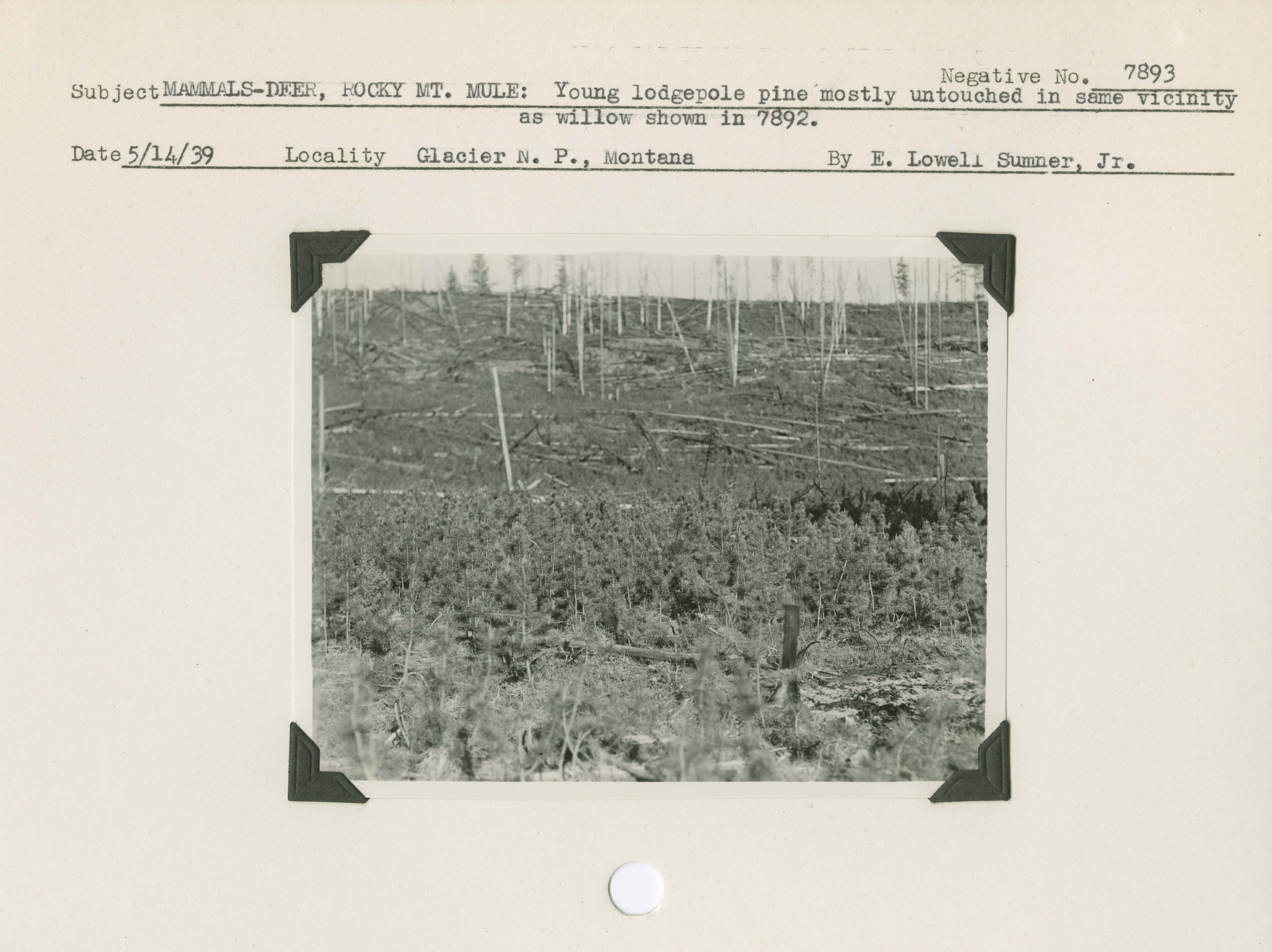 Mammals – Deer, Rocky Mountain Mule: Young lodgepole pine mostly untouched in same vicinity as willow shown in 7892. Negative #: 7893. Locality: Glacier National Park, Montana.