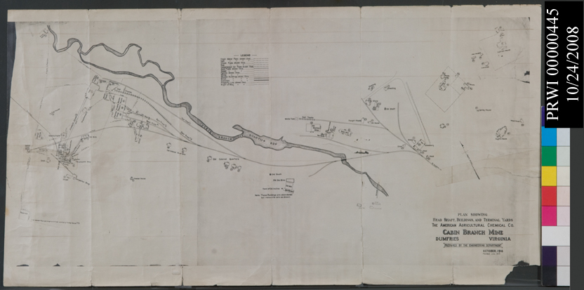 BLACK AND WHITE LAYOUT SHOWING ARRANGEMENT OF BUILDINGS AND ROADS<CRAT THE CABIN BRANCH MINE OPERATION<CRAN ENLARGED AND REGULAR VIEW OF MINE LOCATION<CR<CRPROBABLY GIFT TO PARK FROM JOHN LAUCH