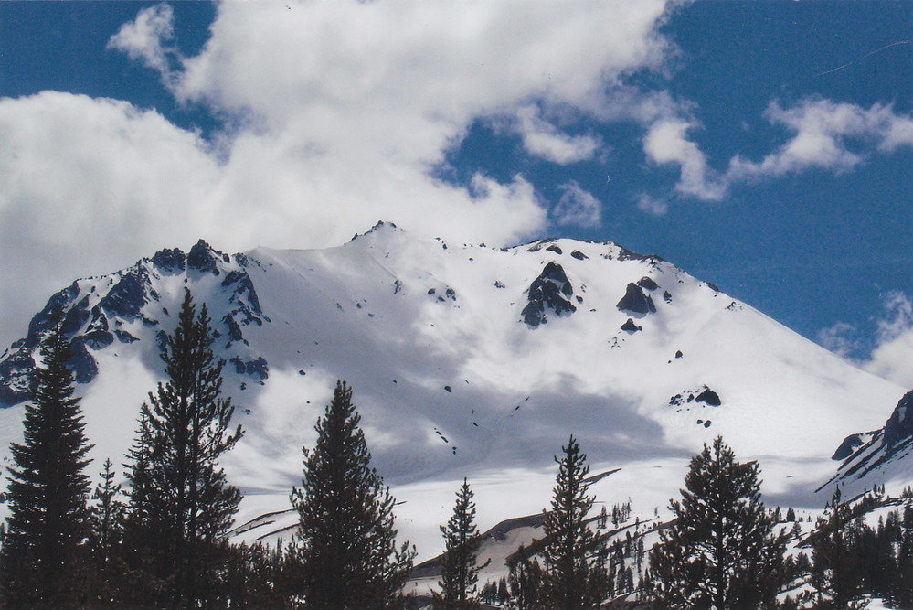 A view of snow-covered Lassen Peak rising above the trees from Devastated Area.