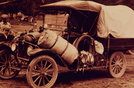 Visitors standing next to a automobile packed with luggage in Yellowstone National Park.
