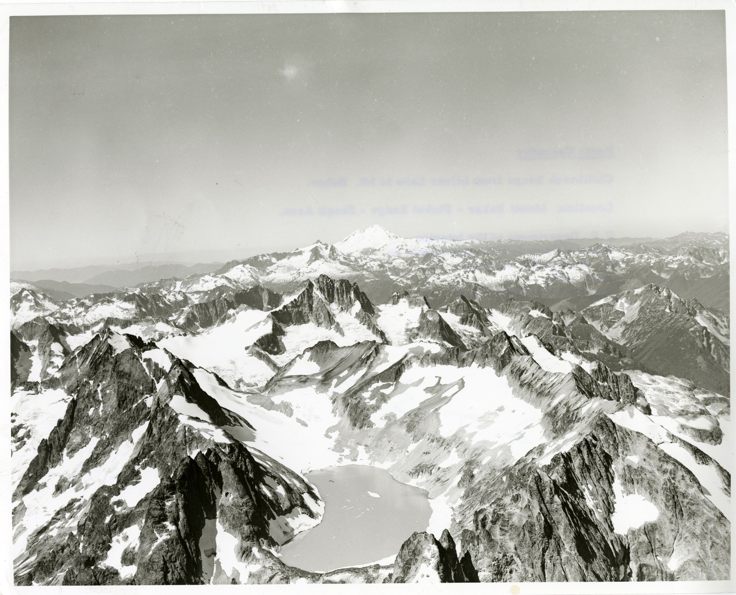 From left to right, oblique aerial view of Mount Spikard, Silver Lake, Mount Redoubt, Mount Shuksan, Mount Baker and Custer Ridge. Many glaciers present. (North Cascades NPS Complex Museum Collection, NOCA.0002 Assembled Collections, Series V: 1963 NPS North Cascades Survey Photographs, Subseries A: Prints and Negatives, File 108)