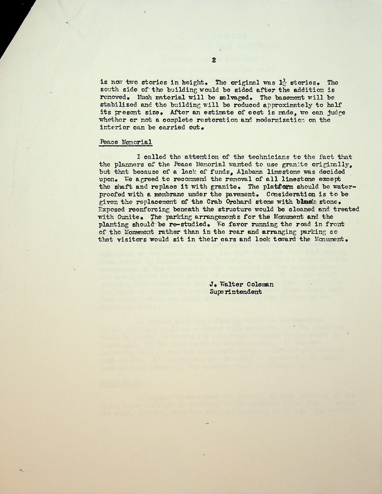 I called the attention of the technicians to the fact that the planners of the Peace Memorial wanted to use granite originally, but that because of a lack of fund, Alabama limestone was decided upon. We agreed to recommend the removal of all limestone except the shaft and replace it with granite. The platform should be water-proofed with a membrane under the pavement. Consideration is to be given the replacement of the Crab Orchard stone with limestone. Exposed reenforcing beneath the structure would be cleared and treated with Gunite. The parking arrangement for the Monument and the planting should be re-studied. We favor running the road in front of the Monument rather than in the rear and arranging parking so the visitors would sit in their car and look toward the Monument.