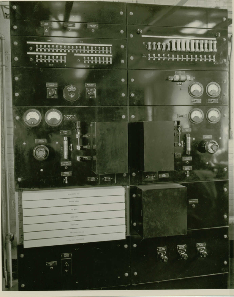Black and white photo of a large electrical panel. Several switches, knobs, and gauges with labels cover the panel.