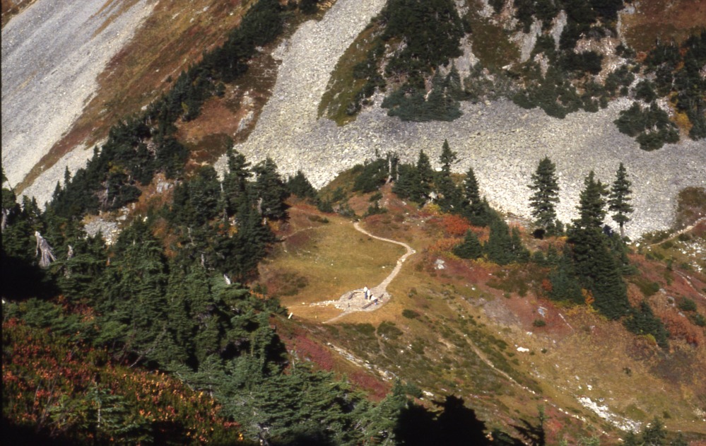 Cascade Pass, Patio, revegetation monitoring photograph. Text on slide frame reads: "REV/CAS/PAT/a-14." Undated, processed 01/1989 (North Cascades NPS Complex Museum Collection, NOCA.0013 Revegetation Program Records, Series XI: Photographs, File 001 - Cascade Pass, Vicinity Impacts and Revegetation Sites, 1970-2004)